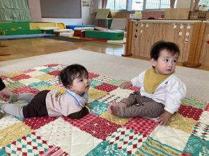 待ちに待ったお弁当。うさぎ・くまぐみさんは、乗馬広場でお弁当を食べました。“ウインナー入っとる”とうれしそうにお弁当を見せ合っていました。