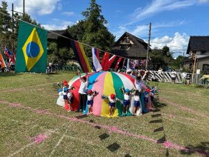 オープニングは、年中、年少さんのパラバルーンとポンポンの演技でした。大きくふくらんだり、パラバルーンの中にかくれんぼしたりして楽しみました。