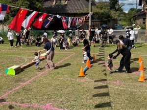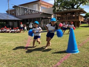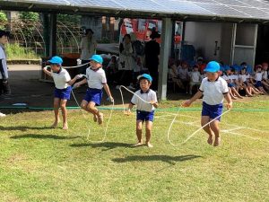 障害走は、年長さんが縄跳びに挑戦したり、日頃の遊びを取入れたいろいろな障害物を乗り越えていました。