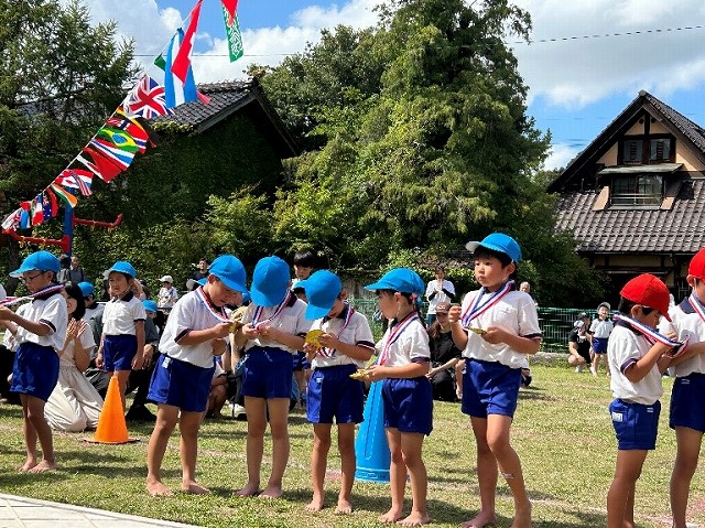 競技や係り、応援など頑張った年長さんに金メダルのごほうびです。とってもかっこよかったですね。