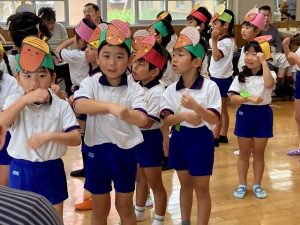 どんぐりのお面をいただき一緒に“どんぐりころころ”の歌をうたいました。