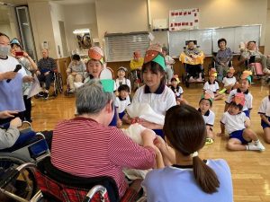入居のみなさんと向かい合って“しあわせなら手をたたこう”の歌でふれあい遊びをしました。