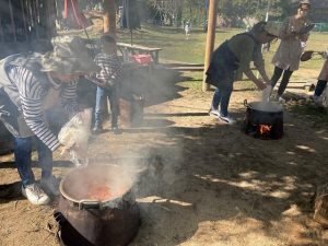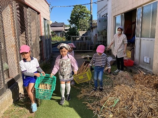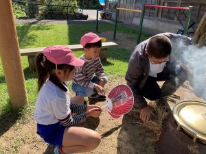 かまど係さんは、薪を運んだり、“けむたい!”と言いながら、かまどの火が消えないように、うちわであおいだりしました。