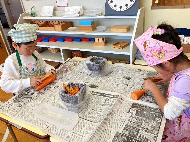 今日のクッキングは、豚汁を作りました。年長さんは、大根や人参の皮むきをしました。