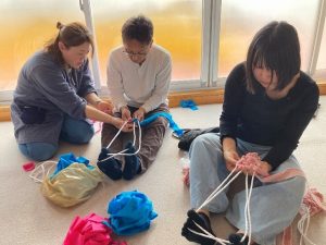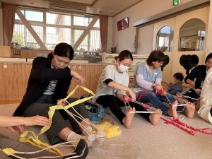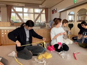 今年もぞうり講習会を行いました。まずはロープに布を巻きつけて、鼻緒を作りました。