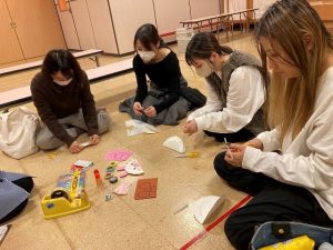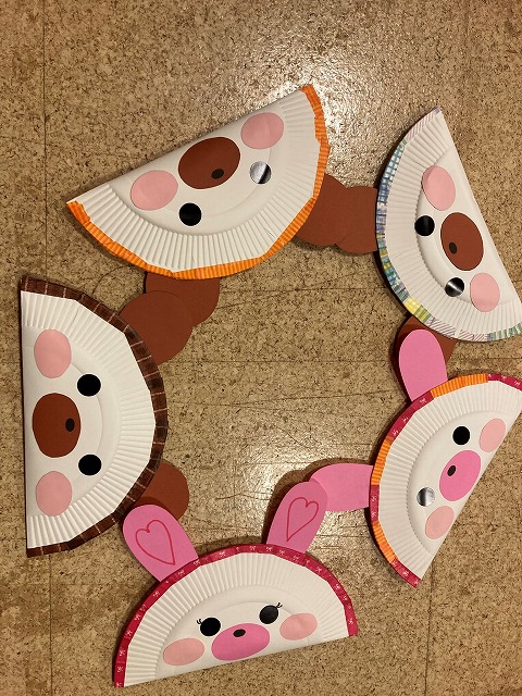 紙皿を使った簡単手作りおもちゃ(タンバリン)を紹介し、みんなで作りました。