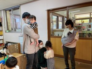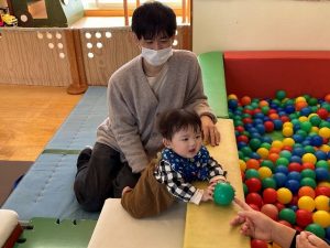保育園探検をしました。いろいろな年齢の子どもがいて、あと1年したらこんな感じになるのかな?と見ておられました。