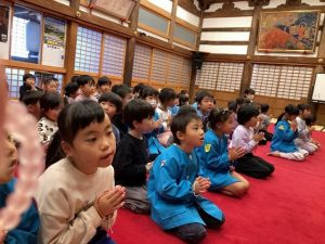 園長先生に続いて、“おやくそく”を言ったり、 親鸞聖人に感謝の気持ちを込めて、♪みていてね の歌をうたいました。