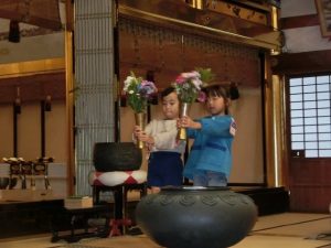 善興寺で報恩講のお参りがあり、子どもたちもお参りしました。お参り当番さんがお花をお供えして、