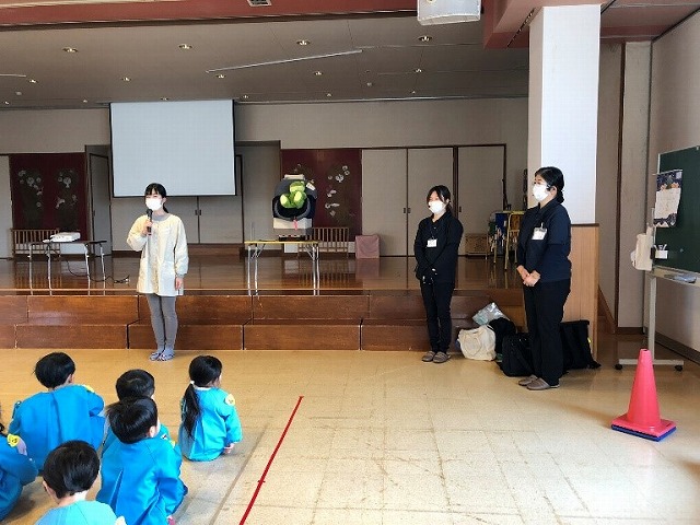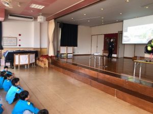 保育園の前の道の歩き方、渡り方をスライドを通して確認しました。駐車場でも遊びませんの約束をしました。