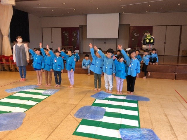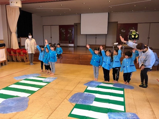 くま組さんもやってみました。3つのやくそく “止まる”“手をあげる”“左右を見る” をみんなしっかり覚えていました。