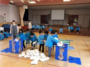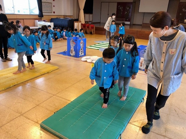 マットを雪道に見立てて、ゆっくり歩幅を小さくして歩く練習もしました。今日教えていただいたことをしっかり守りましょう。