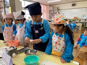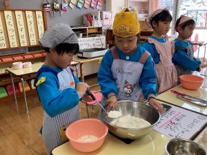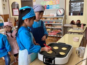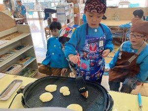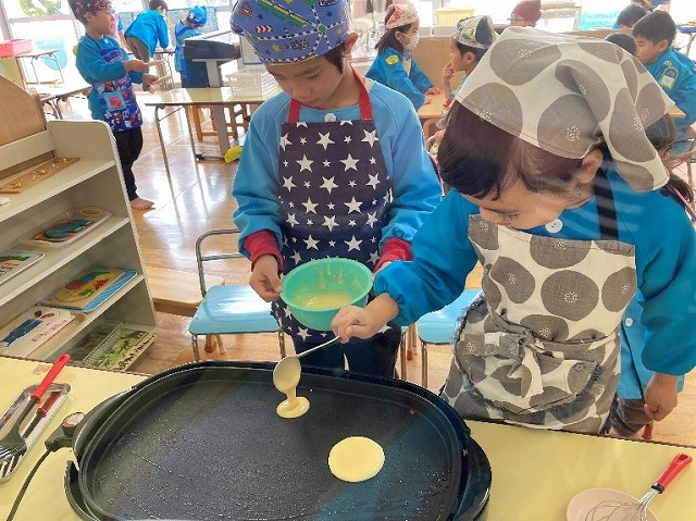 ホットプレートに生地を入れるのは、年長さんがしてくれました。