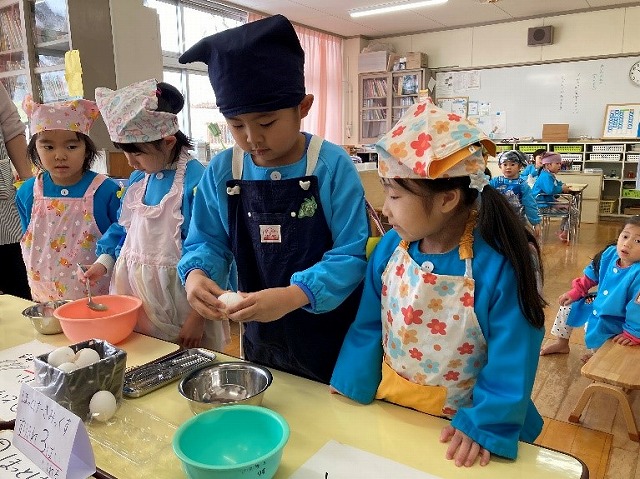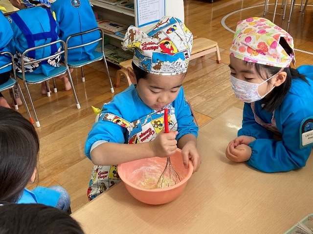 今日のクッキングは、“ホットケーキ”を作りました。“ドキドキする”と言いながら、卵を割っていました。