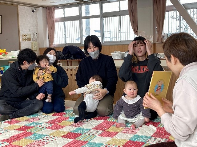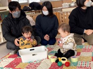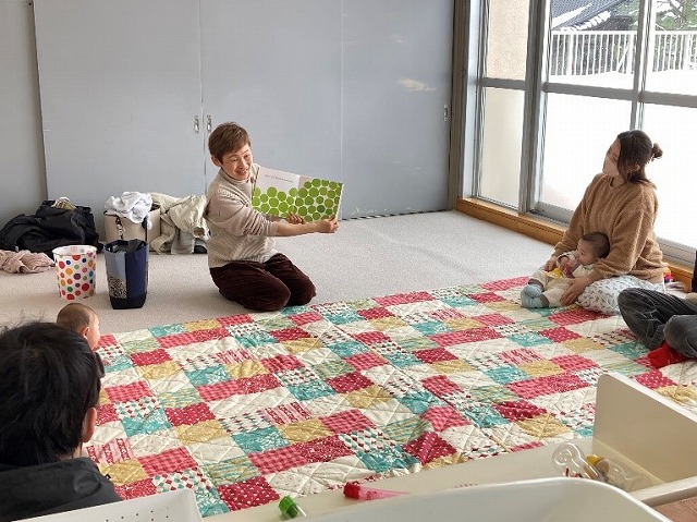 最後に絵本を見ました。心地よい言葉に、意味は分からなくても真剣に見ていましたね。次回は2月10日おひな様を作ります。また遊びに来てください。