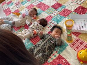 今日は、ベビーイングリッシュの日で、“Hello!”とあいさつをしました。絵本を見ながら、言葉はわからなくても同じ動きをして楽しんでいました。