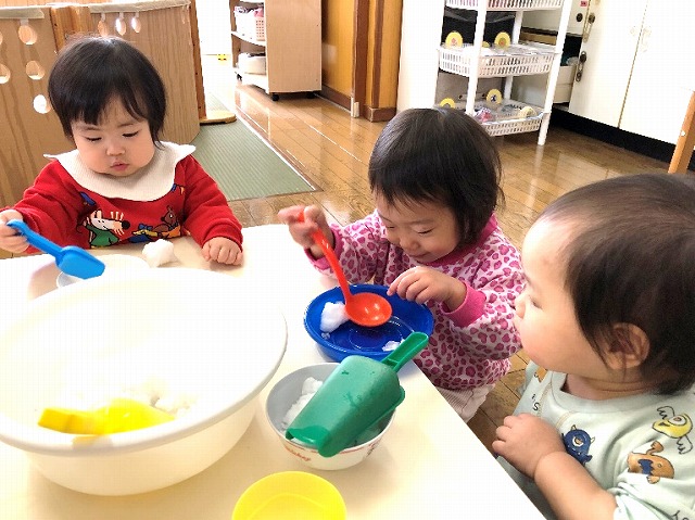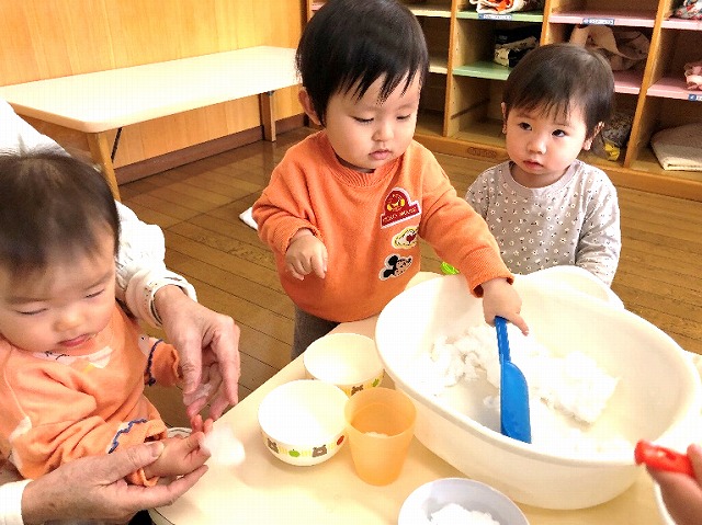 園庭に雪が積もったので、室内で雪あそびをしました。