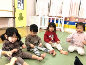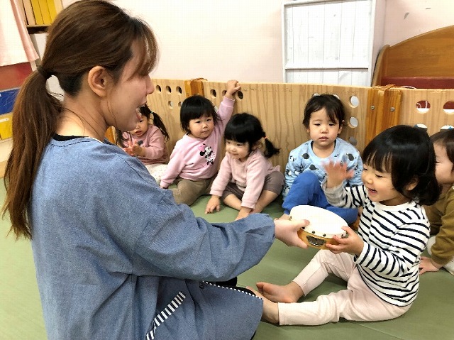 なまえを呼んだ後、タンバリンをたたいてお返事をします。だんだんじょうずに「はあい」と言えるようになってきました。