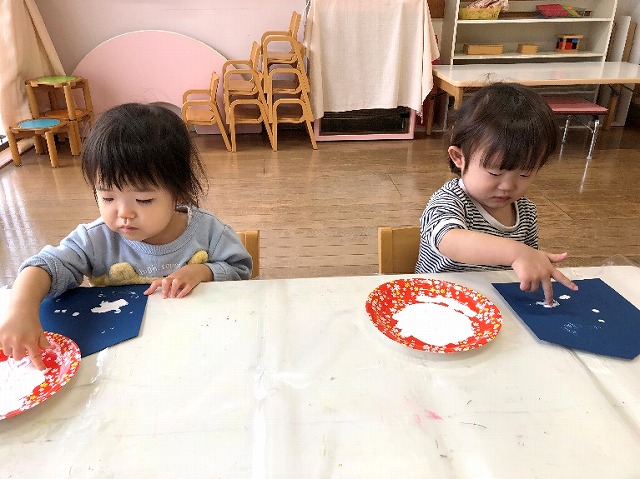 白いえのぐを雪に見立てて指スタンプをおしました。ペタペタペタ…たくさん雪がふりました。