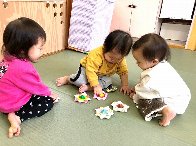 くるくるまわる折り紙のコマに興味しんしんです。じょうずに回せるかな?