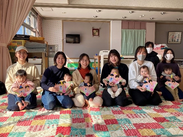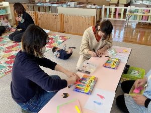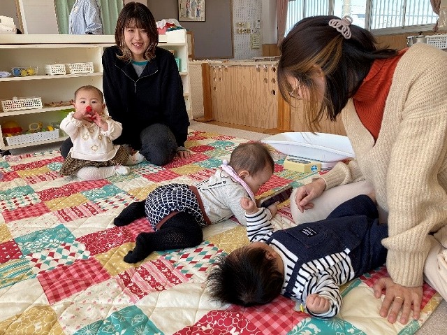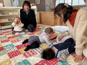 お座りやうつ伏せ、あおむけ、それぞれの月齢に合った体勢で遊んでいました。