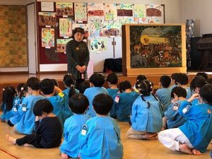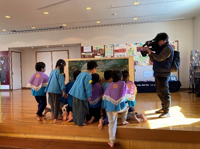 近くでねはん図を見せてもらい、 “いろんな動物おるね”と 真剣に見ていました。お家でねはん図のぬりえをぬってくださいね。高岡ケーブルテレビの方が今日の様子を撮っていかれました。