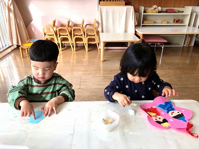 はじめてのりを使いました。ふしぎそうにのりにさわりつつも一生懸命指でのりをのばしていました。
