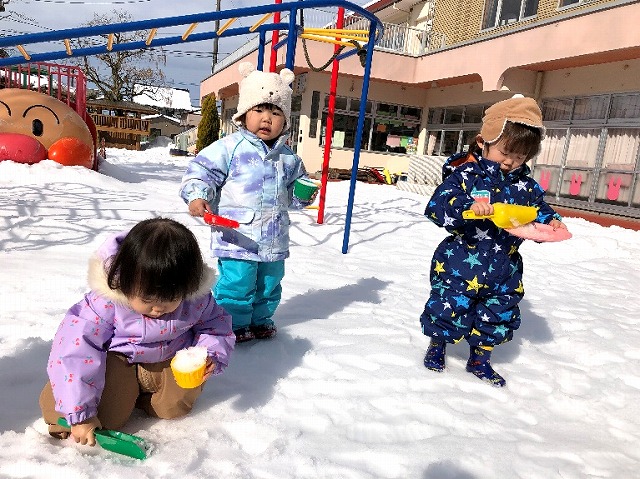 たくさん雪がつもったので、お外で雪あそび。カップに雪をつめて、ケーキ作りも楽しみました。