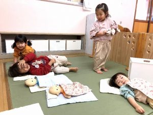 お人形さんを布団にねかせ、いっしょにねんね。きもちよさそうです。