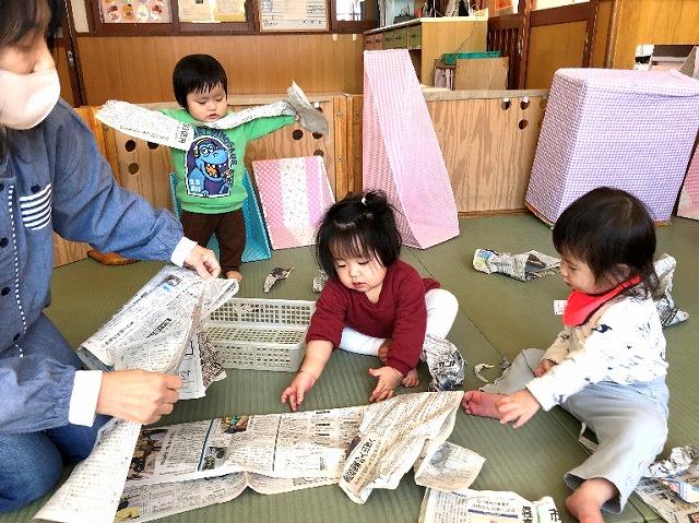 ビリビリビリ…とちぎったり、くしゅくしゅにまるめてみたり指先をたくさんつかってあそびました。