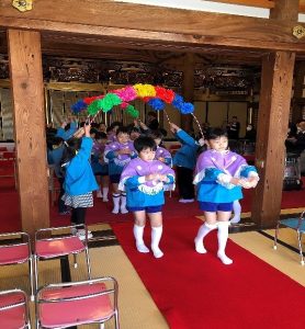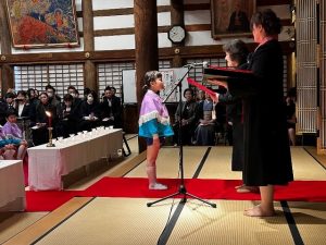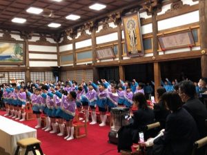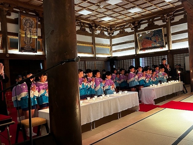 令和7年度の卒園式を行いました。本堂の阿弥陀さまの火をいただいたろうそくを持って入場し、園長先生とお参りをしました。