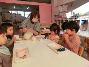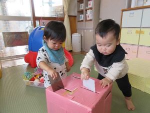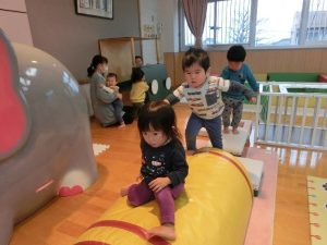 室内でもからだを動かしてたのしんでいます。牛乳パックでつくったロノジーを次々に両足ジャンプをしたりまたいだりして乗り越えています。
