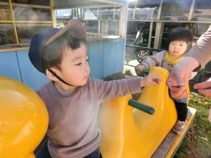 ガチャガチャの空き容器を、ペットボトルで作ったスライダーに転がして遊びました。転がっていく様子を面白そうに見ています。