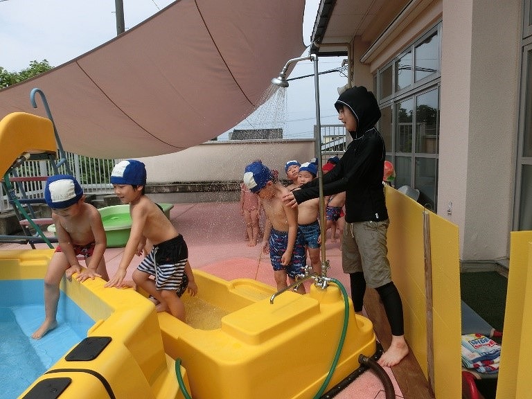 外で遊んだ後は足を洗ってからお部屋に入ります。保育者が足を洗う様子をじっと見ていますね。