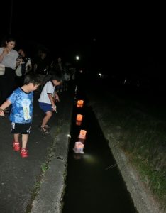 くらやみ探検最後は灯ろう流し。ろうそくの火に浮かび上がった絵がとてもきれいでしたね。