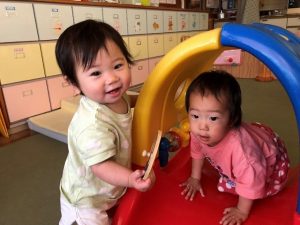 2歳児組さんは、いろいろな動物になっておふろにやってきました。みんなで背中の洗いっこ、かわいらしかったですね。