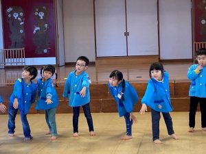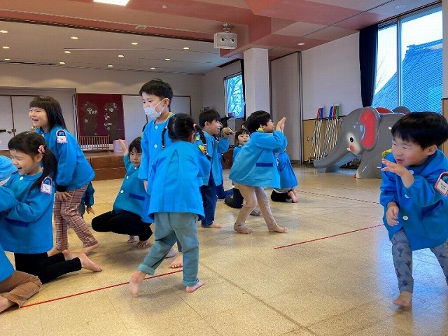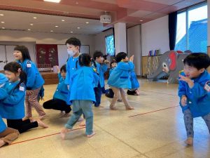♪ホーキーポーキーの歌にあわせ、手や頭、お尻をシェイク!楽しい動きに笑いが止まらない子どもたちでした。